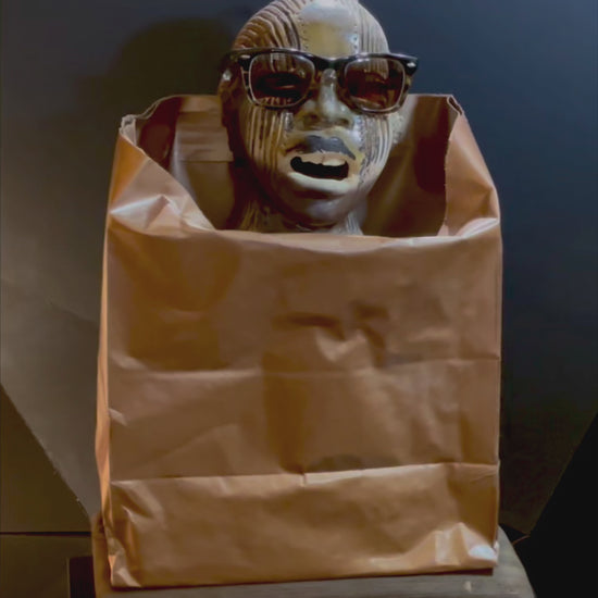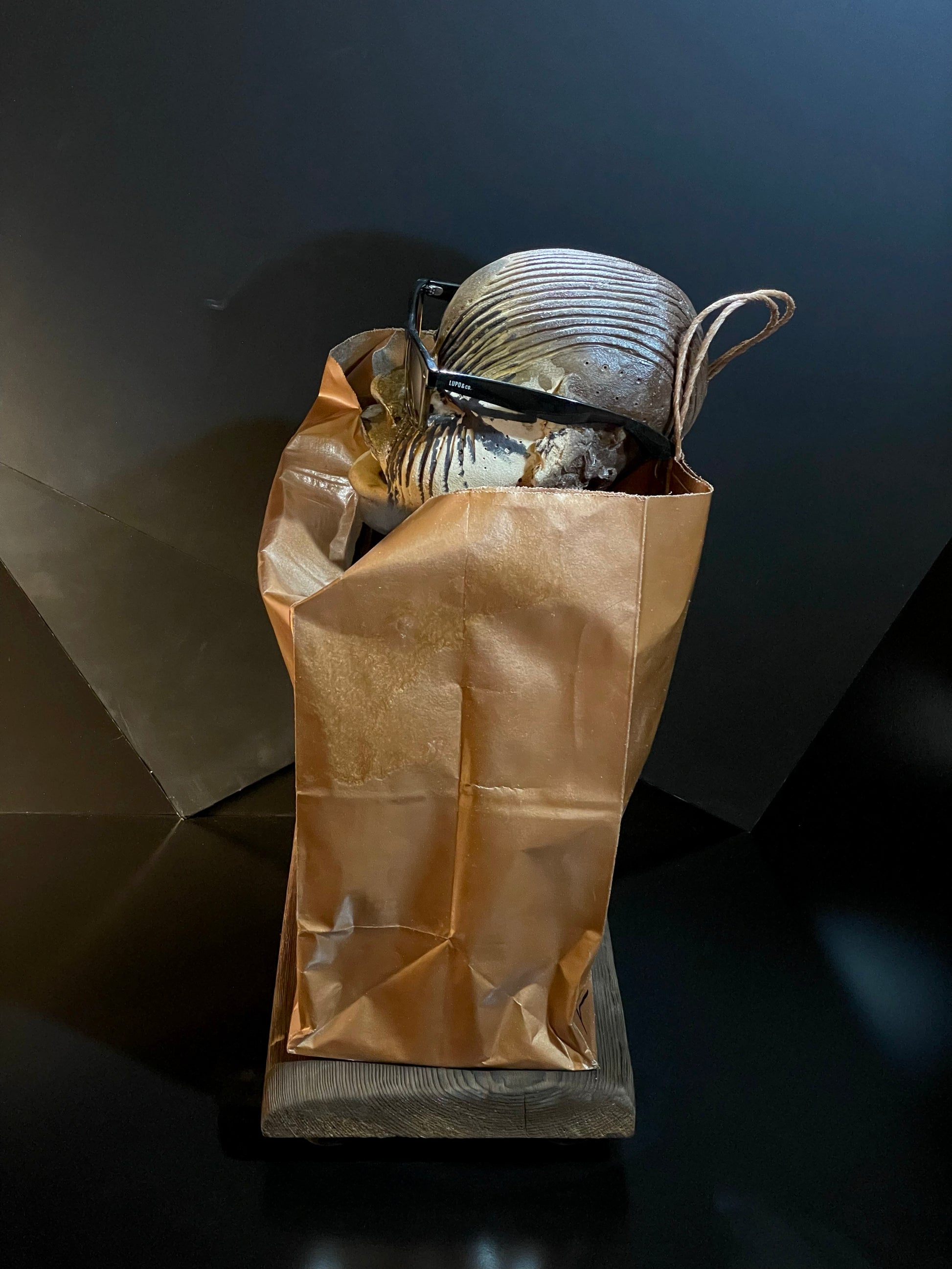 - Materials: Fired stoneware clay, paper (bag), wood, glaze, spray paint, sunglasses